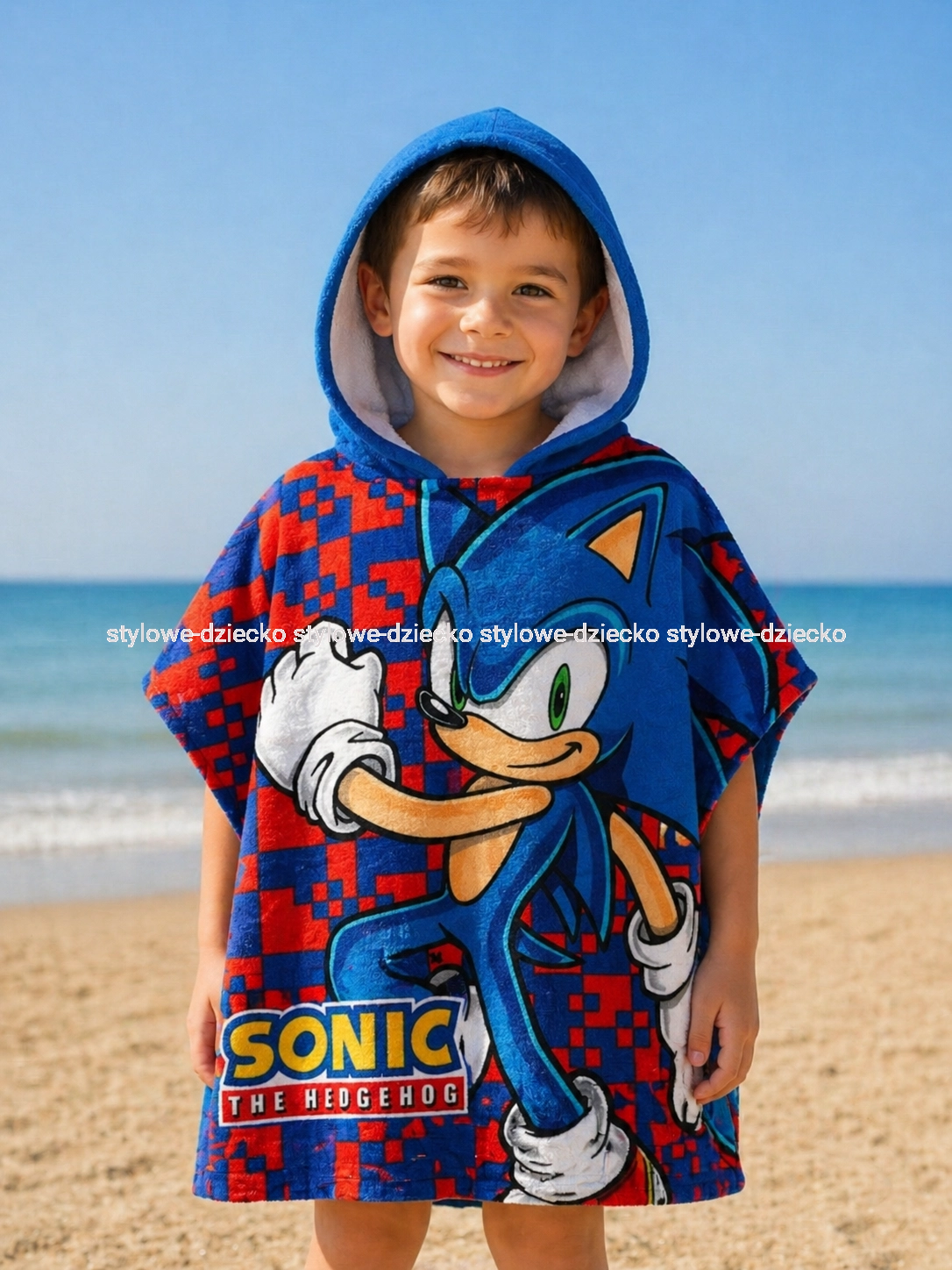 - To kolorowe ponczo z wizerunkiem najszybszego jeża na świecie – Sonica – to idealny wybór na plażę, basen lub do domowego użytku po kąpieli.
