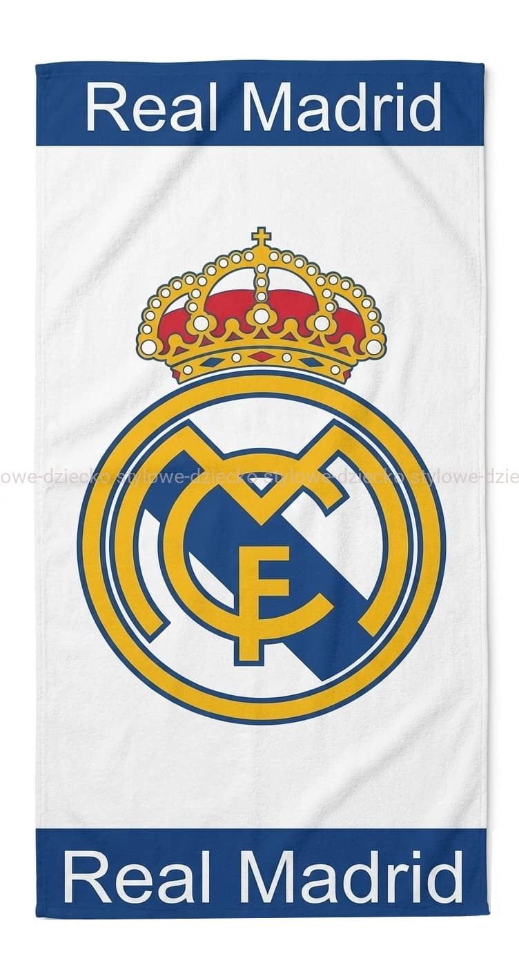 - Białe tło z dużym, wyraźnym herbem klubu oraz eleganckie niebieskie pasy z napisem "Real Madrid" sprawiają, że ręcznik prezentuje się profesjonalnie i stylowo