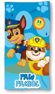 - Duży, kolorowy ręcznik dziecięcy na plażę lub basen z motywem pieska Chase i Rubble z bajki Psi Patrol